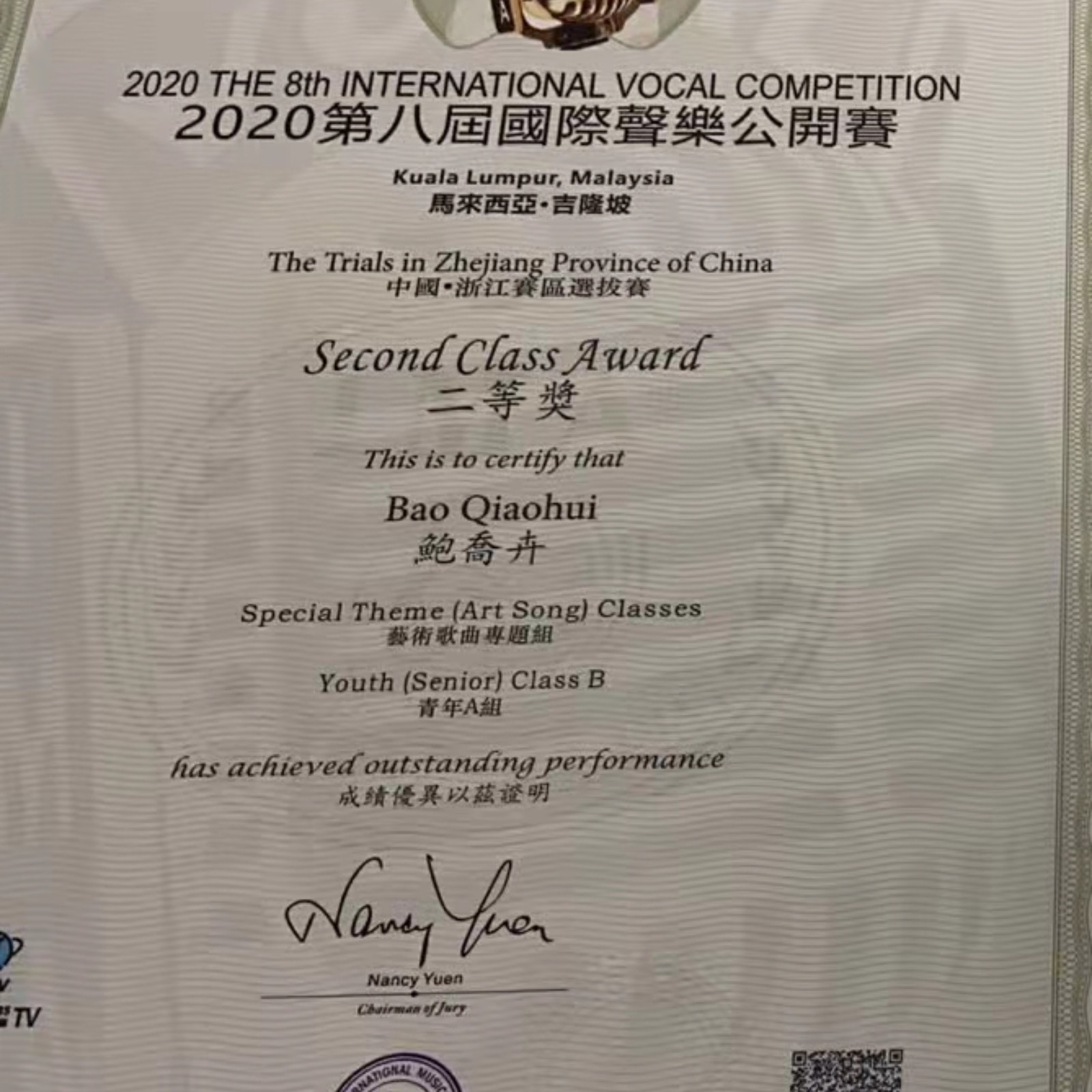 ?2020第八屆國際聲樂公開賽 二等獎